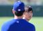 練習の合間にドジャースの大谷翔平(手前)と言葉を交わす水原一平通訳=2024年3月3日、アメリカ・アリゾナ州グレンデール