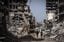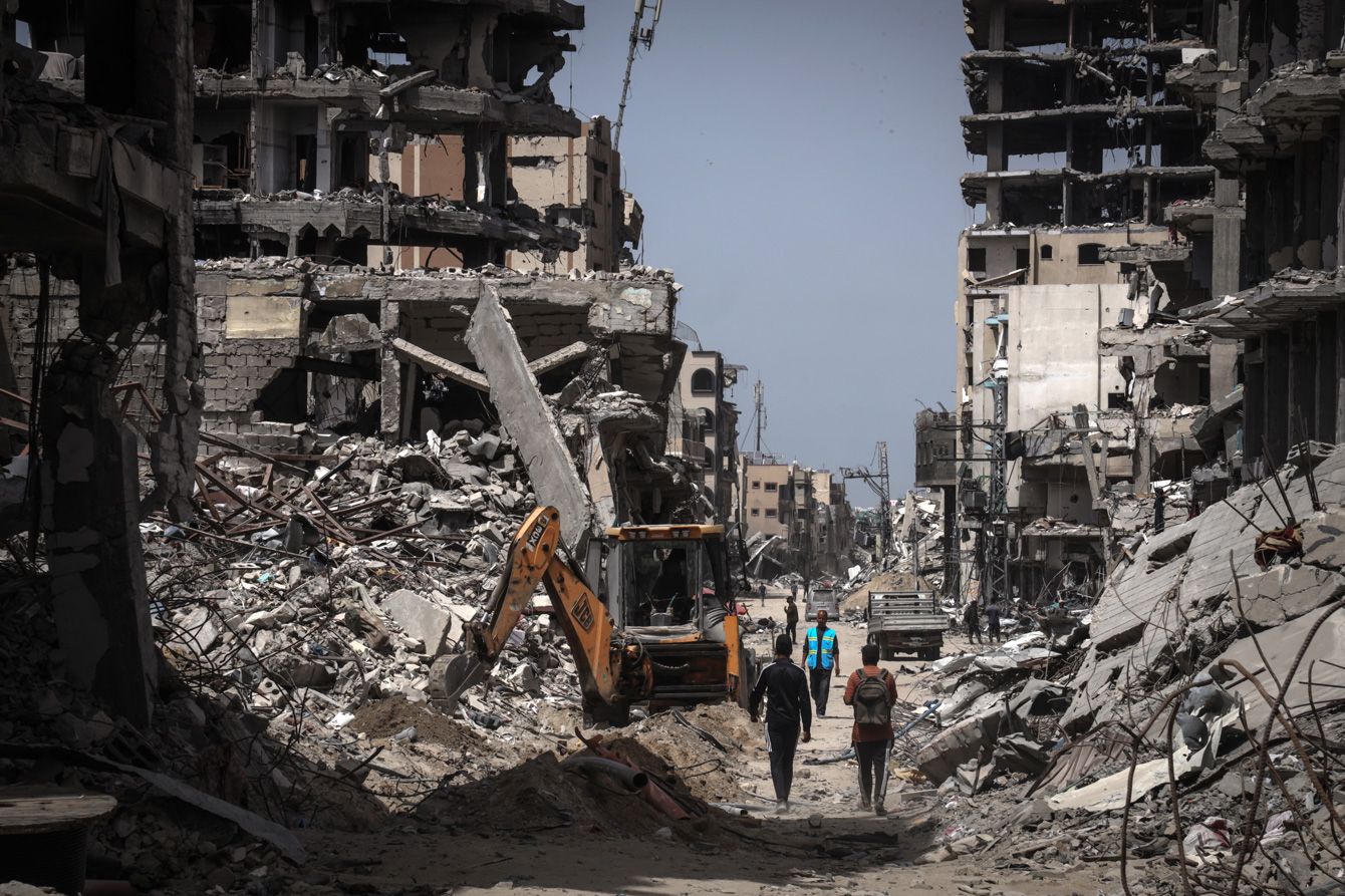 イスラエルとパレスチナの過激派組織ハマスとの紛争が続く中、ガザ地区南部のカン・ユニスの破壊された建物が並ぶ道路を歩く人々(=2024年4月23日、パレスチナ)
