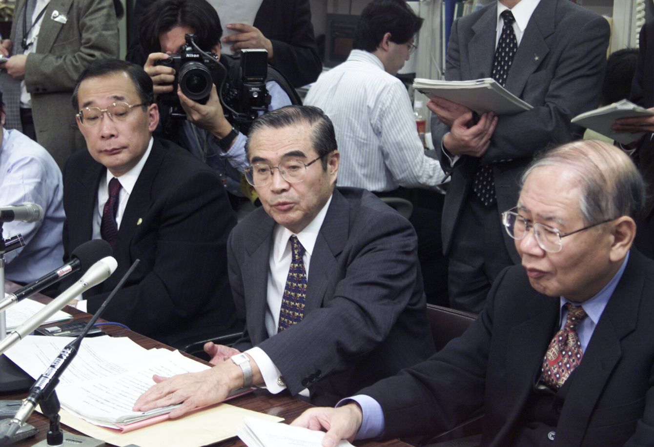 2001年11月22日、東京地裁に更正特例法適用を申請した大成火災海上保険の小沢一郎社長(中央)(東京・日銀記者クラブ)