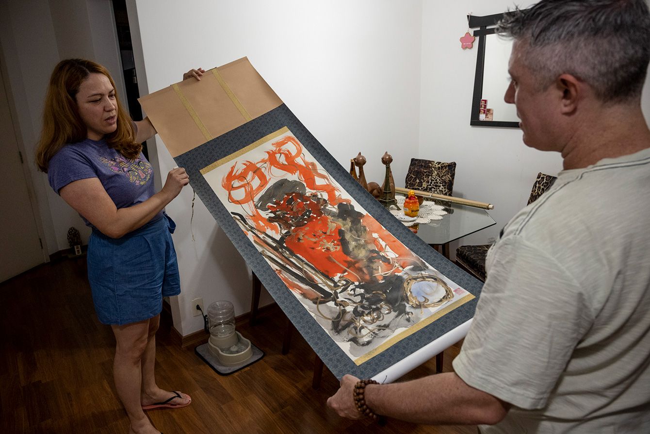 自宅で初見宗家の手による不動明王の掛け軸を見せてくれたカルドーゾ夫婦