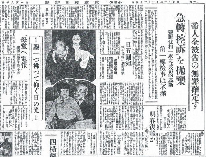 帝人事件で無罪が確定し、被告であった大野龍太(大蔵省銀行局特別銀行課長)、三土忠造(元鉄道大臣)の喜びの表情を写真入りで報じた『東京朝日新聞』1937年12月24日付