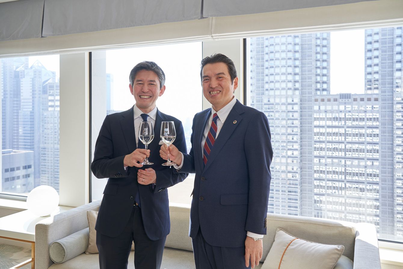 旭酒造の桜井一宏社長(左)と、京王プラザホテルの若林克昌社長