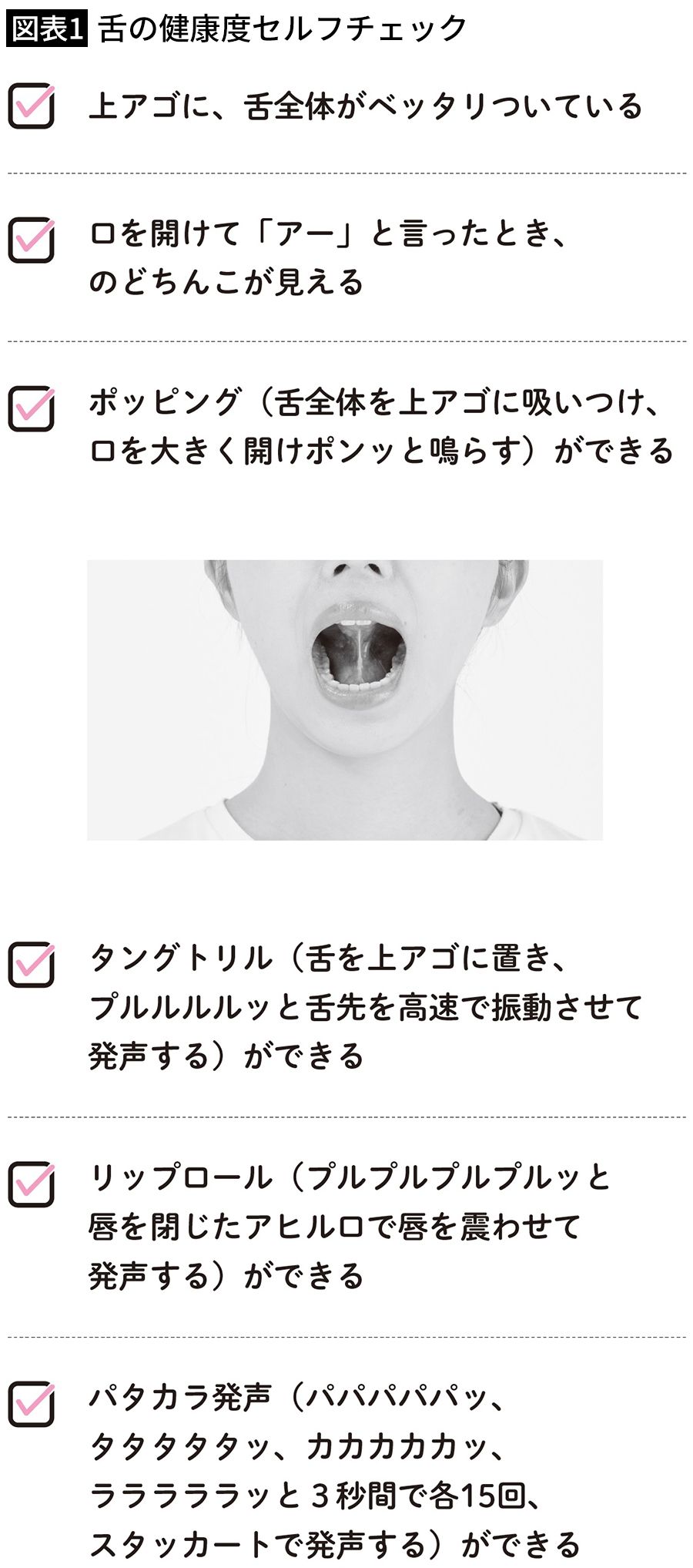 これができたら健康な舌。一方、全部満たせない場合には、舌力低下が疑われる。(『