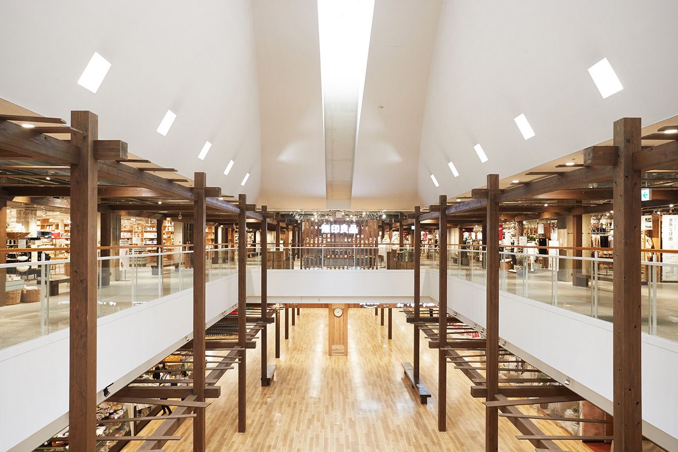 豪雪地域の文化的建築様式である雁木造を共用部に設けた無印良品 直江津の店内(画像=