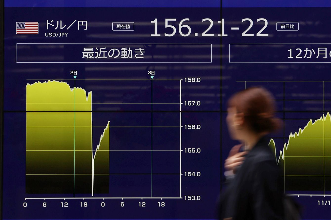 乱高下した円相場を示すモニター=2024年5月2日午前、東京都千代田区