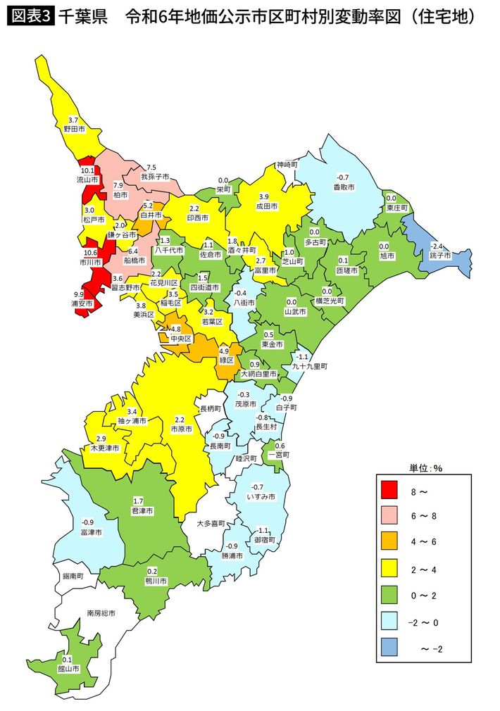 令和6年地価公示 市区町村別 平均変動率地図(住宅地)