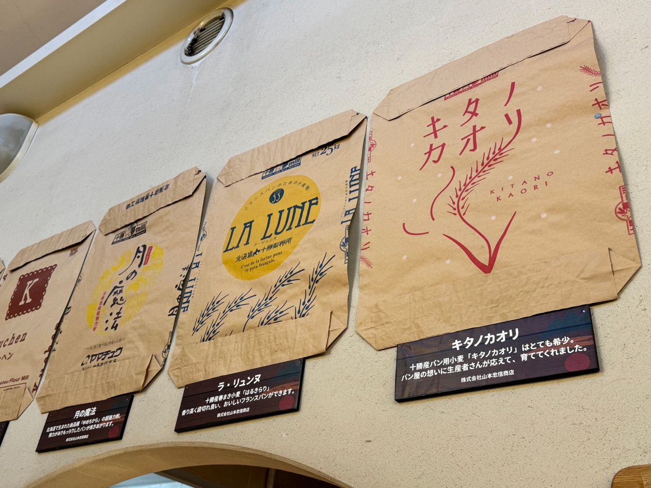 「麦音」の壁面には、小麦粉の袋が飾ってある。「地元十勝の小麦でパンを焼く」というこだわりが見てとれる。