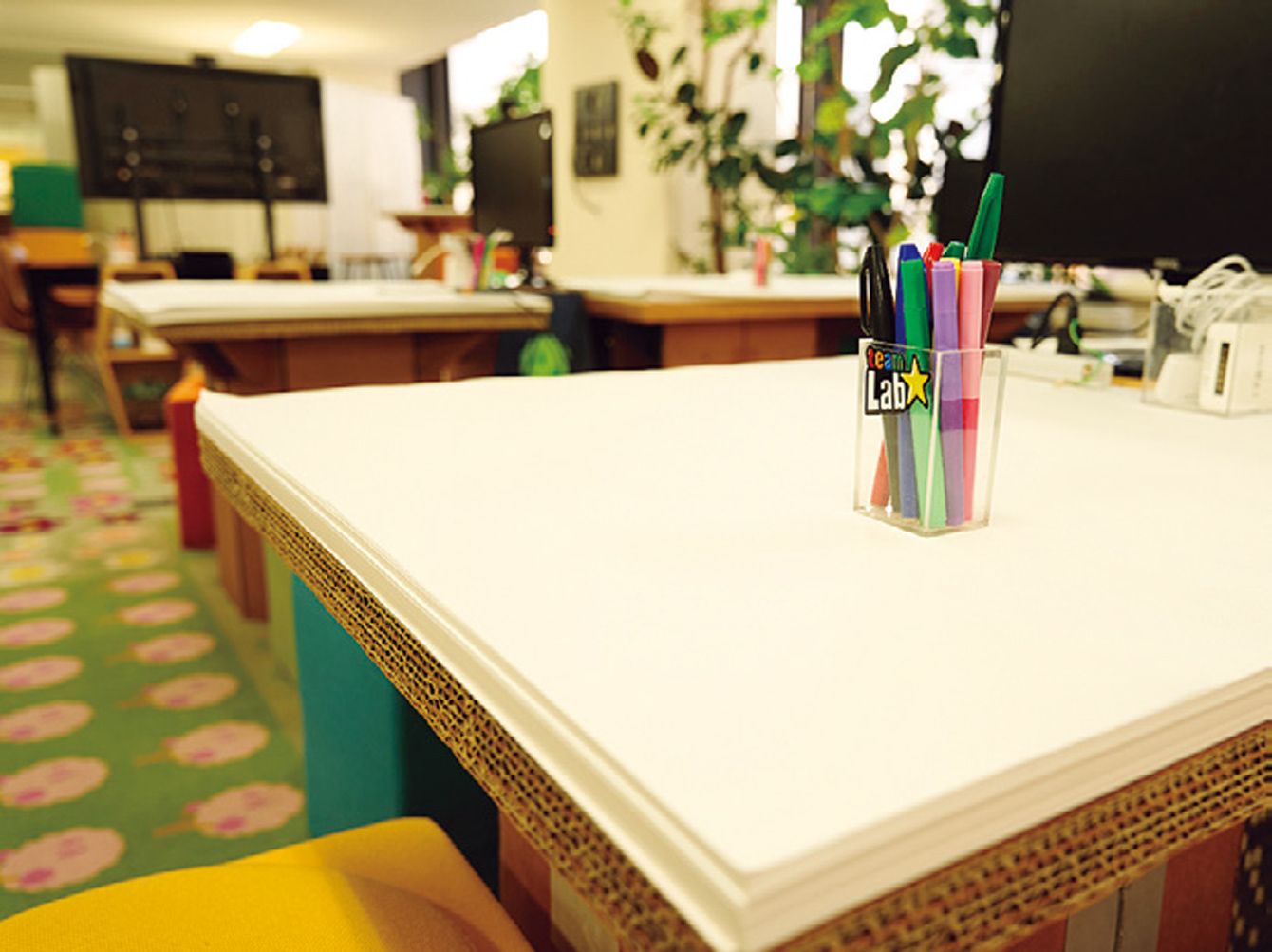 メンバー間で活発にコミュニケーションが取れるよう、天板を分厚いメモ帳にした机がオフィス内に置かれている。
