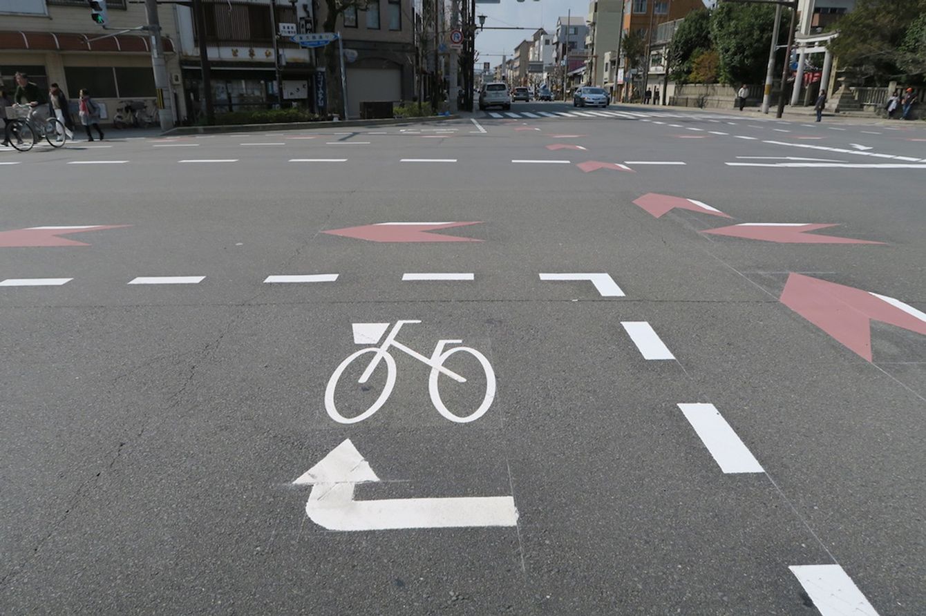 自転車ピクトグラムに従って道路を走行する自転車