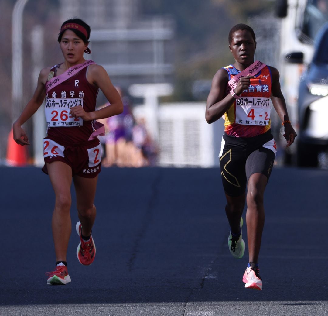 全国高校駅伝の女子2区、立命館宇治の大西桃花(左)を抜き、先頭に立つ仙台育英のデイシー・ジェロップ。2023年12月24日、京都市内[代表撮影]