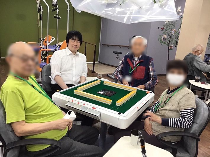 ウェルチャオの利用者と麻雀を楽しむ小林剛さん