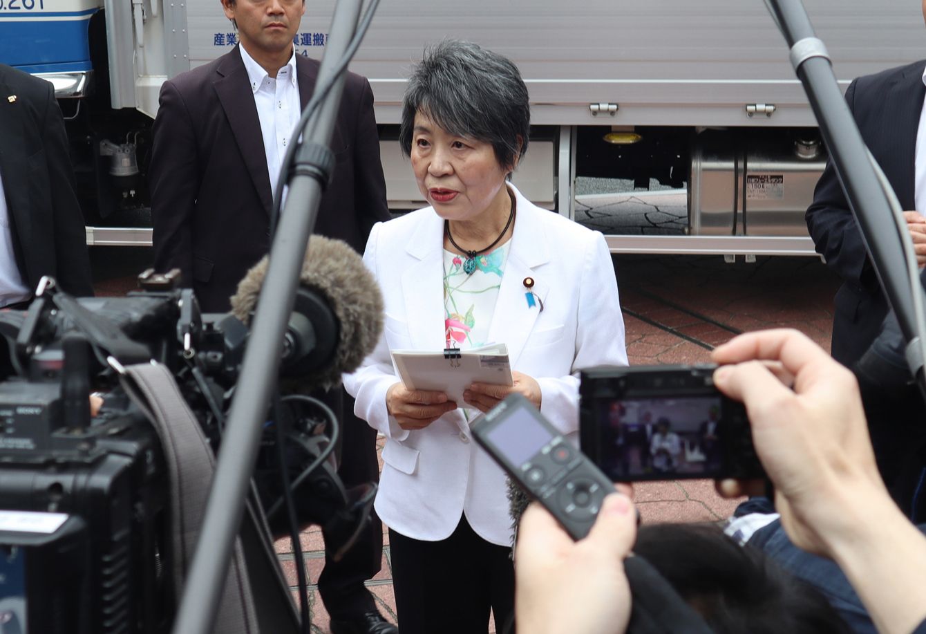 静岡県知事選での発言を撤回する上川陽子外相(中央)=2024年5月19日、静岡市内