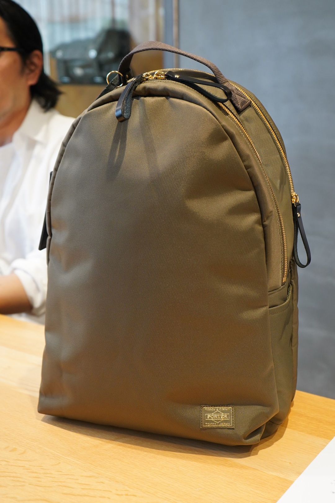 スーツ姿に馴染みやい四角いフォルムの『ポーター リフト』のデイパック。ファスナーをあえて斜めにしているのが特徴的だ。
