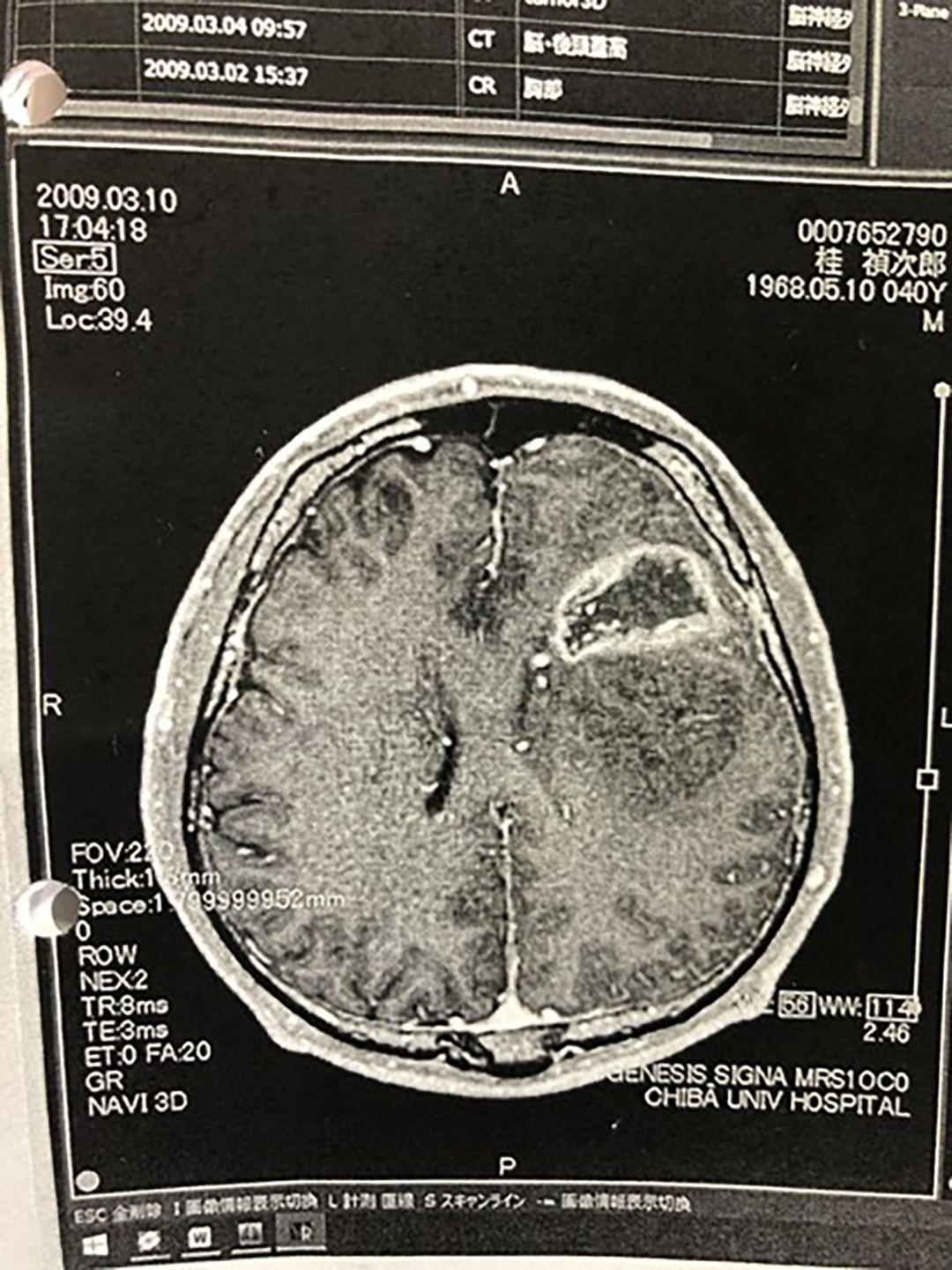 脳の画像は下からとるので左右が逆になる。桂禎次郎の2009年3月10日のMRI画像。左脳にある白い環は「リングエンハンス」といい、膠芽腫の典型的な画像。(写真=『