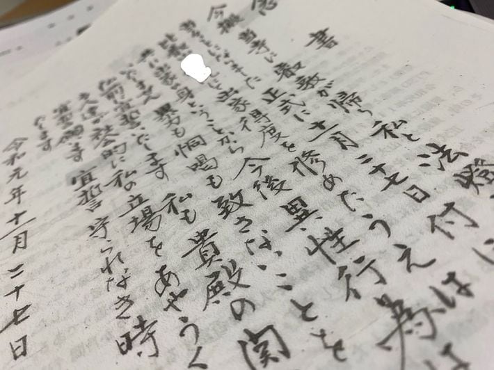 加害者のA氏が叡敦さんの求めに応じて書いた最初の念書。毛筆に半紙で記載され、A氏の印鑑が押されている