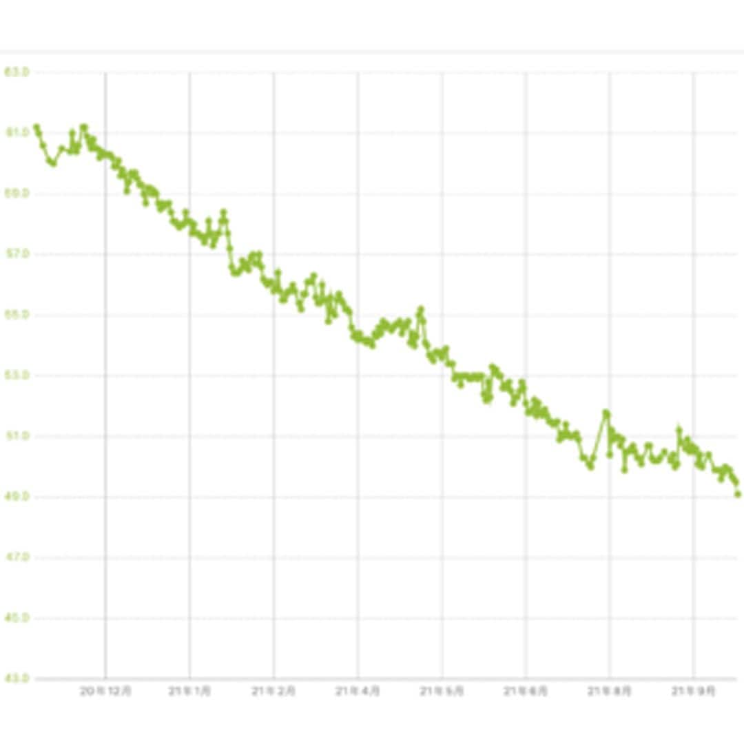 筋トレだけしかしていなかった最初の1カ月は体重が戻ってしまったが、食事管理をしてからはグラフが右肩下がりに