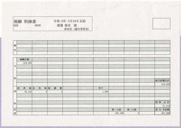 新宿区議・渡辺やすし氏の給与明細。報酬月額は61万9000円、所得税などの控除が5万410円で、振込額は56万7590円と書かれている。