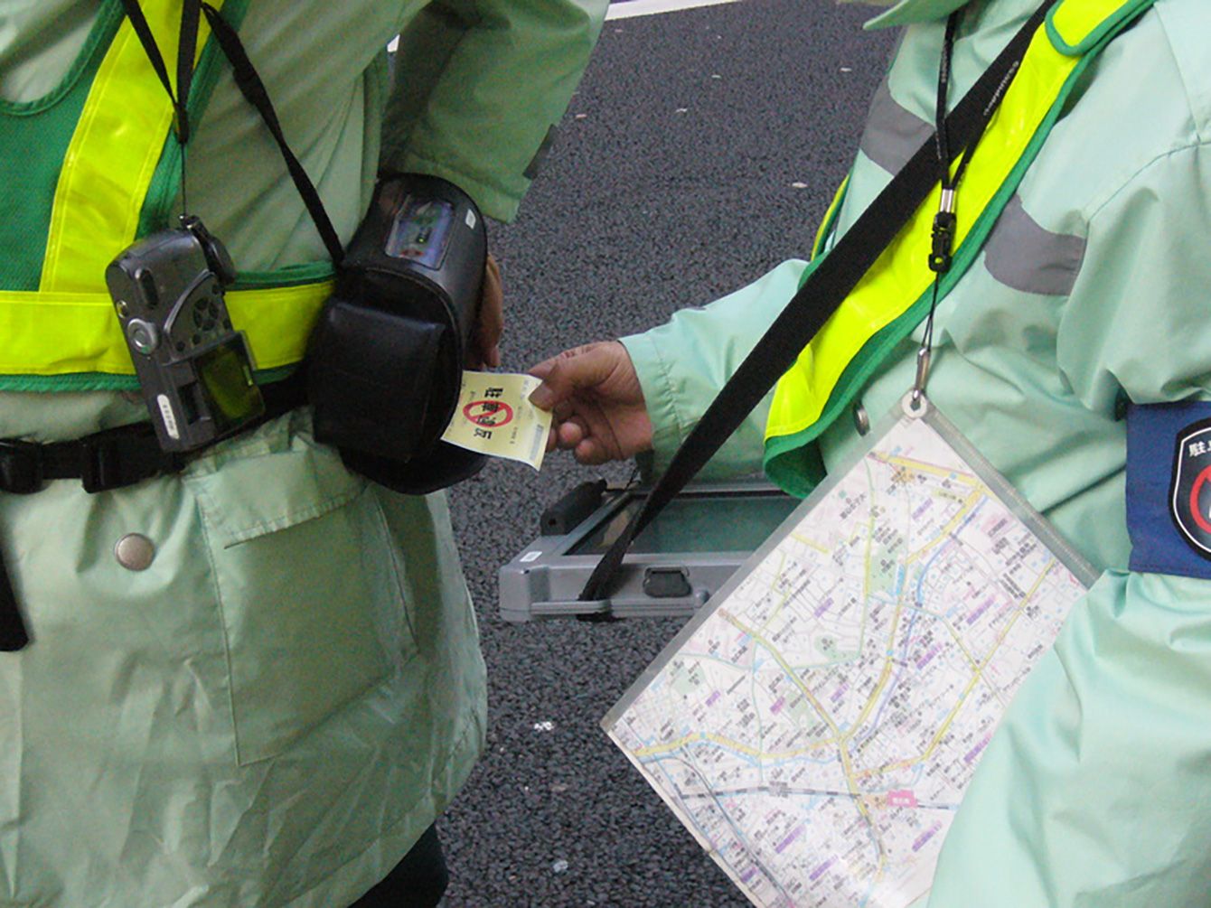 駐禁ステッカーを発行する駐車監視員
