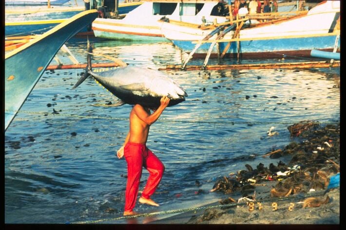 パヤオ監視役のパンプボートが漁獲した日本向け刺身用キハダを運搬する荷役、フィリピン・ゼネラルサントスにて1997年筆者撮影
