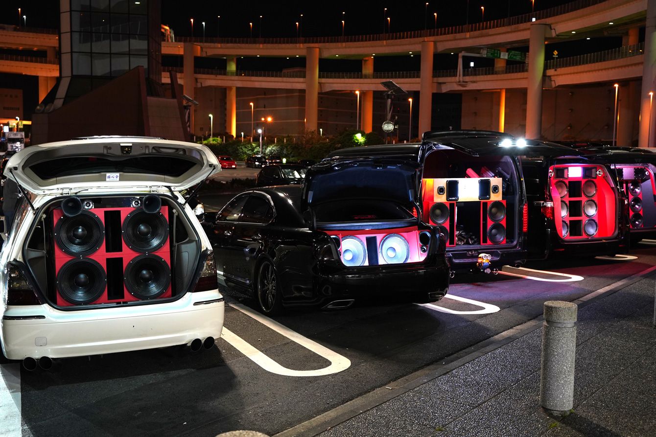 ド派手な電飾で注目を集める改造車。PA内なら問題ないがこれで公道走行は違反となる