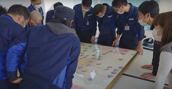 「減価償却」について学ぶ松本興産社員。わかりにくい概念なので、レゴを使い、実際の工場をイメージしながら勉強している 写真提供=松本興産