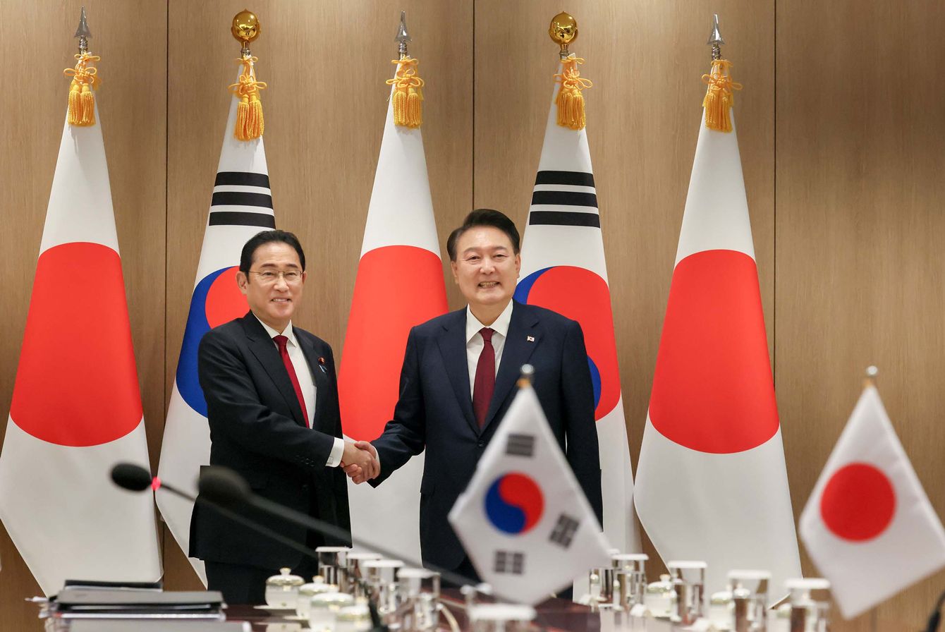 2024年5月27日、韓国・ソウルで開催された韓中日首脳会談の傍ら、共同記者会見に臨む日本の岸田文雄首相(右)と握手する韓国の尹錫悦大統領(左)。