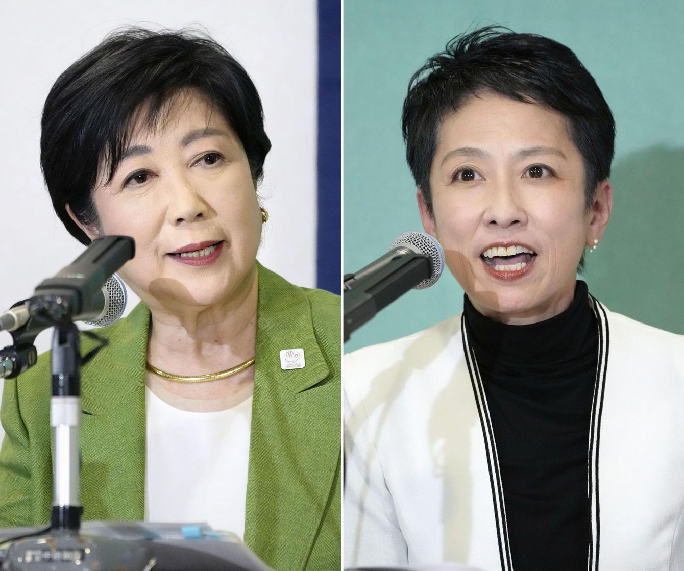 東京都知事選立候補予定者の共同記者会見をする小池百合子氏(左)と蓮舫氏=2024年6月19日午後、東京・内幸町の日本記者クラブ