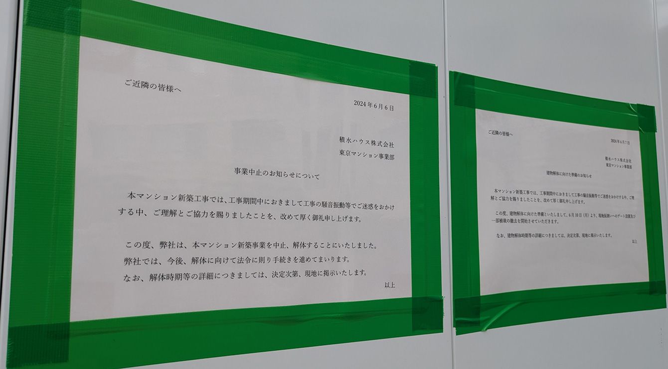 マンション前に貼られた2枚の張り紙。「事業中止のお知らせについて」(6月6日付)と「建物解体に向けた準備のお知らせ」(6月7日付)
