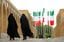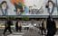 2024年4月16日、イラン・テヘランで、イラン最高指導者ハメネイ師(上左)とイラン最高指導者故ルーホッラー・ホメイニー師(上右)の壁画の前を歩くイラン人たち