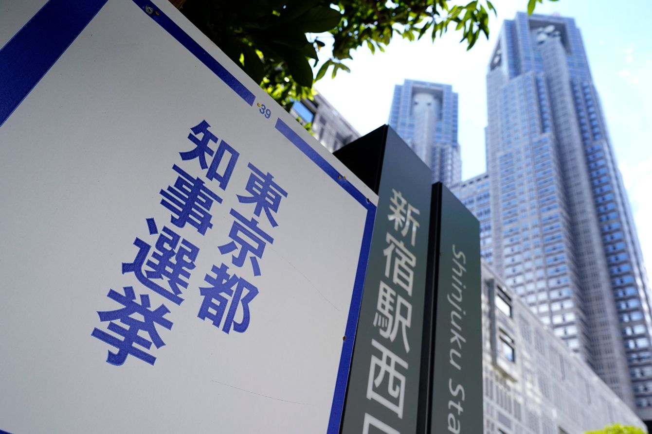 東京都知事選のポスター掲示場と都庁舎(東京都新宿区、2024年6月24日)