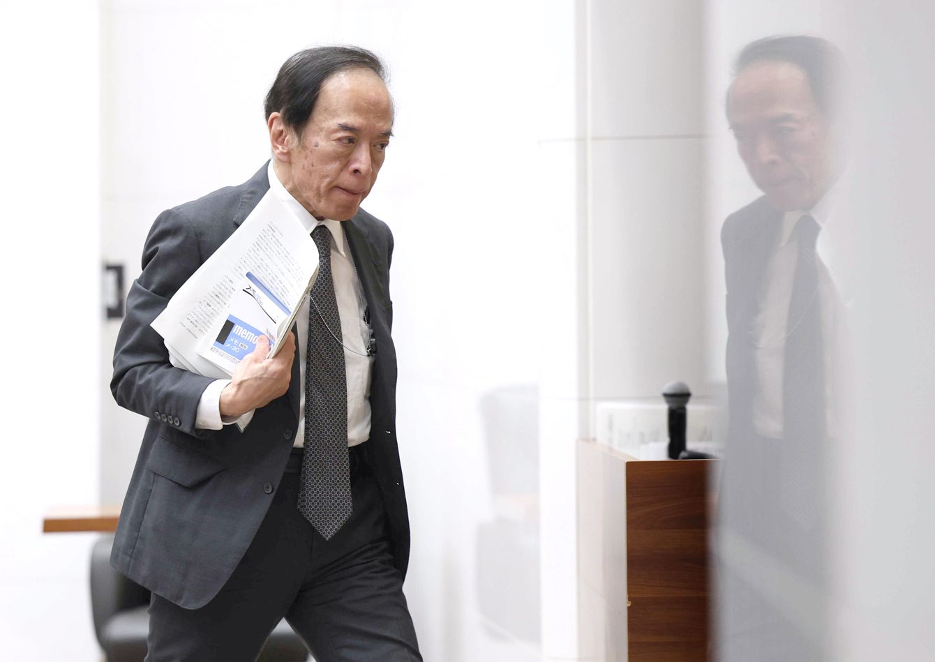金融政策決定会合後の記者会見を終え、退出する日本銀行の植田和男総裁=2024年6月14日午後、東京・日本橋本石町の同本店