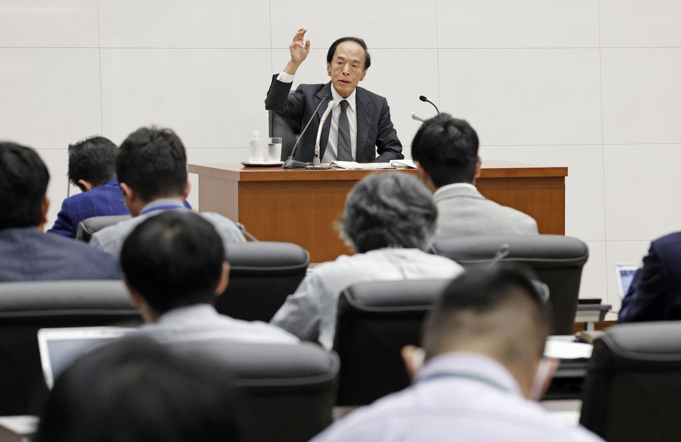 苦境映す小出しの修正 金融政策決定会合後に記者会見する日銀の植田総裁=2024年6月14日午後、日銀本店