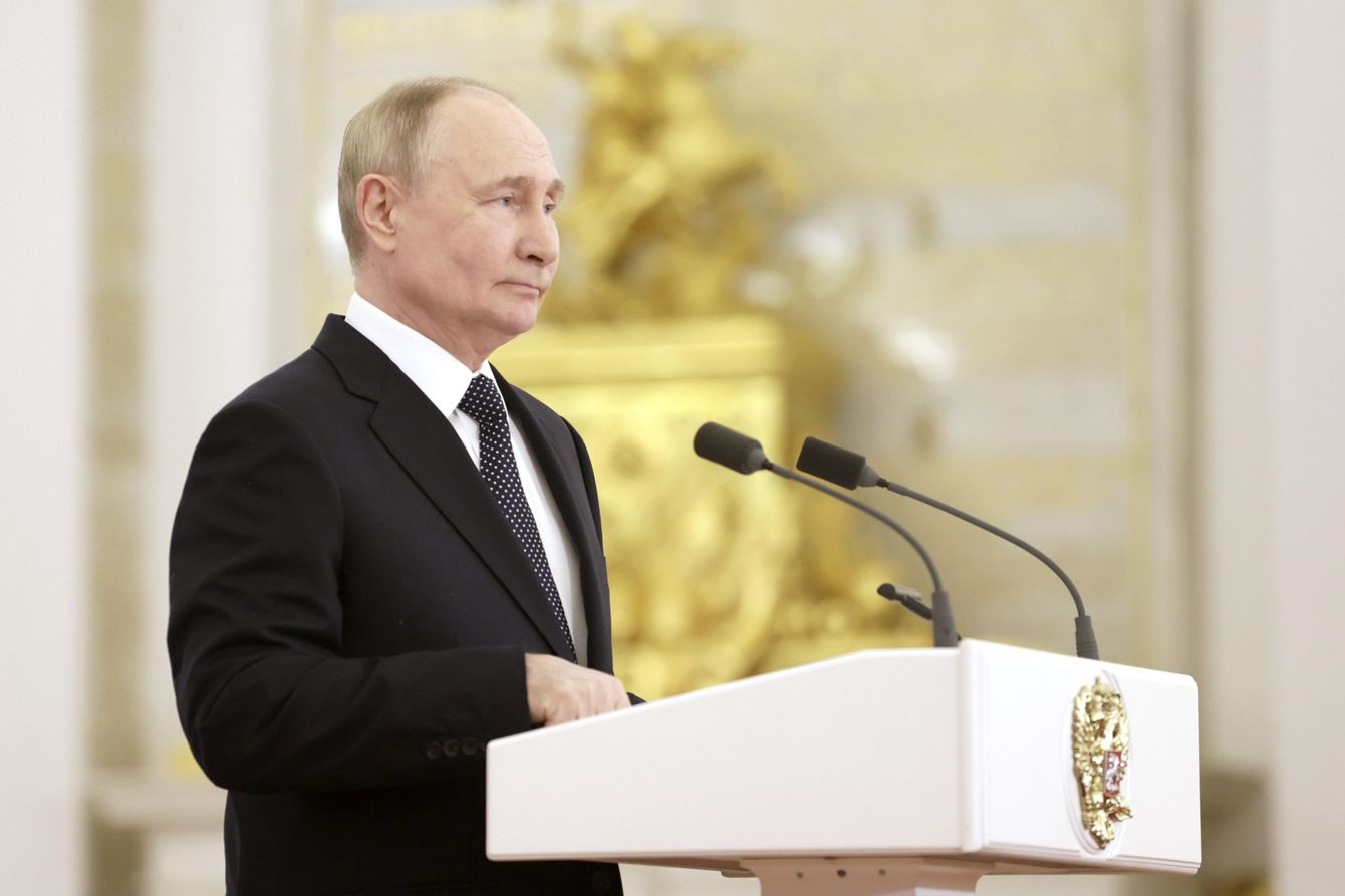 演説するプーチン大統領「核の3本柱」の開発継続 2024年6月21日、モスクワのクレムリンで軍大学校の卒業生らを前に演説するロシアのプーチン大統領