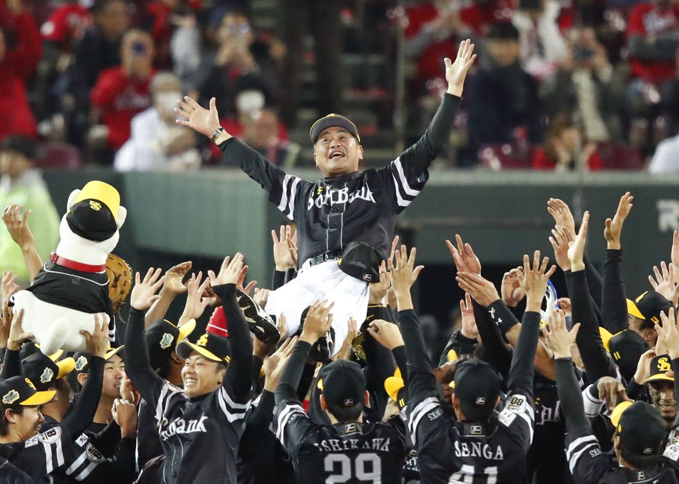 日本シリーズで2連覇を果たし、胴上げされるソフトバンクの工藤監督=2018年11月3日、マツダ