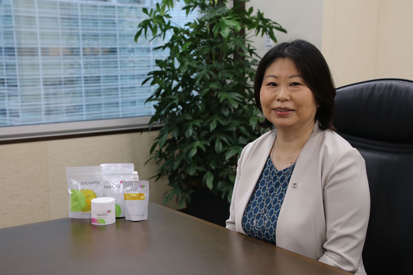 大塚製薬 佐賀栄養製品研究所 所長 上野友美さん。研究開発に携わった「エクエル」「トコエル」を前に