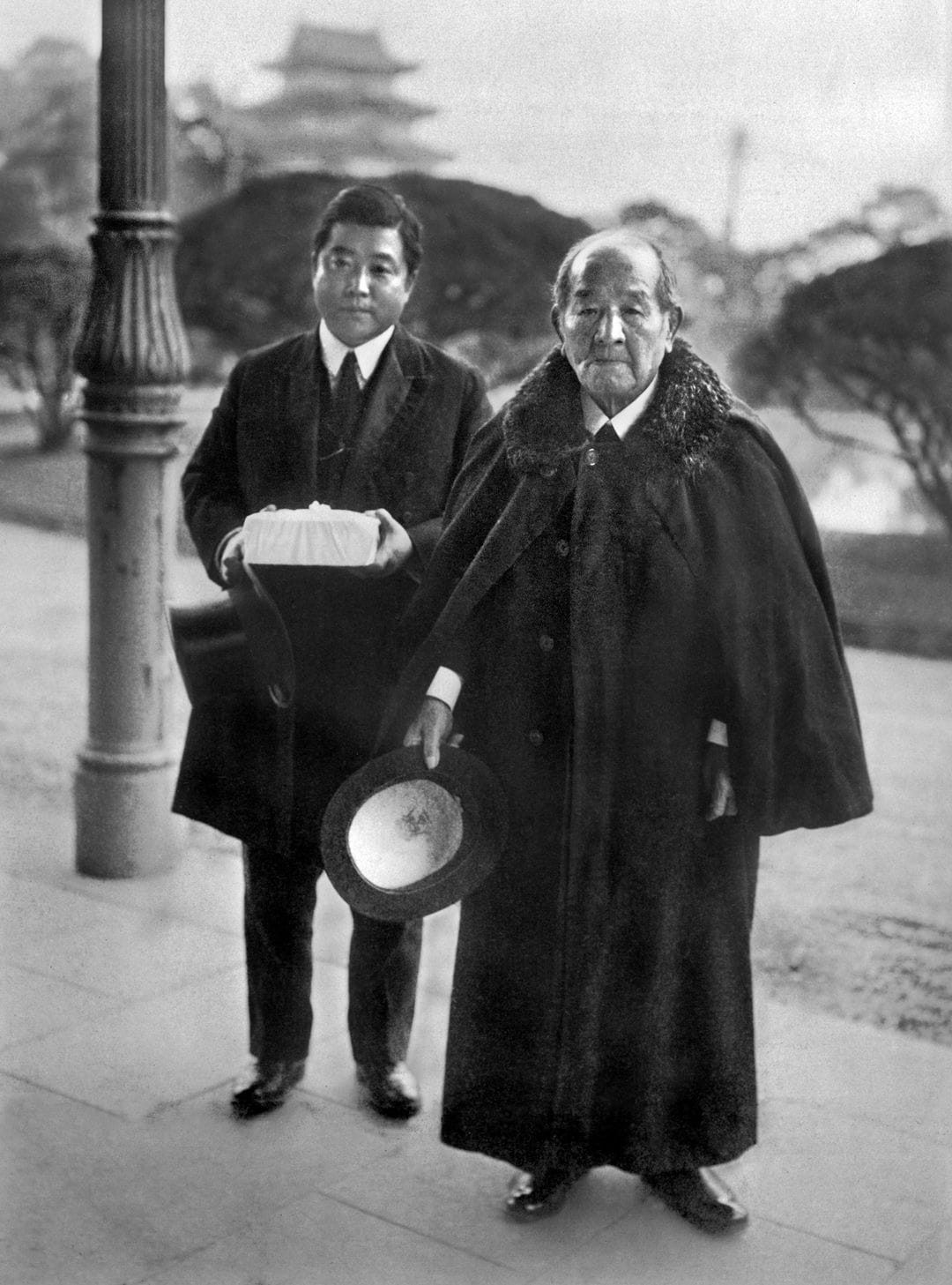 昭和天皇との会食を終え退出した渋沢栄一(右)。左は付き添った孫の渋沢敬三=1929年12月19日、宮内省玄関前(日本電報通信社撮影)