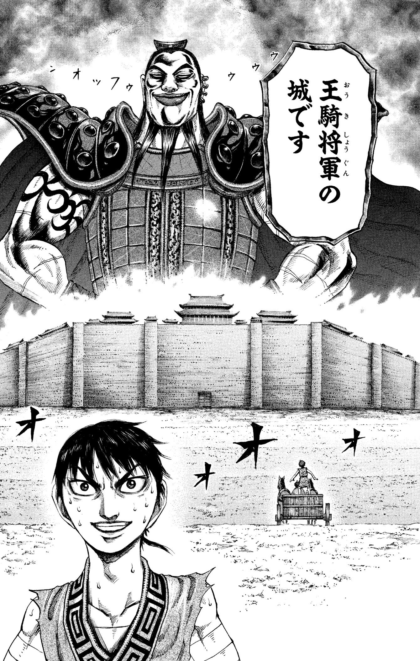 王騎と信。周から春秋時代までは、王騎が治めたような城でひとつの国だった。城壁の外までは支配できていない。出典=『
