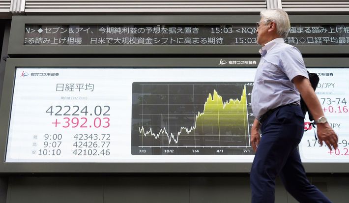 4万2224円02銭で取引を終えた日経平均株価を示すモニター=2024年7月11日午後、東京都中央区