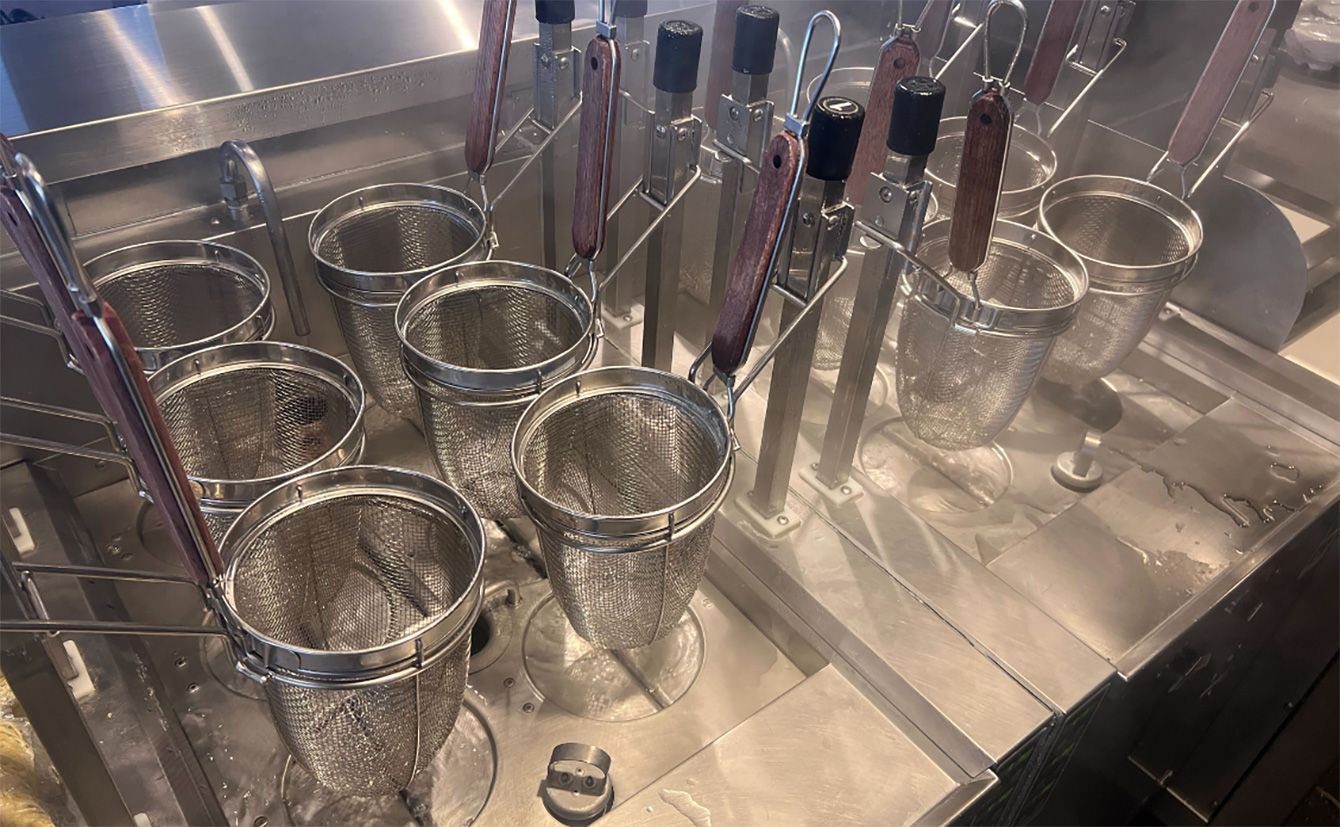 ラーメンの麺の茹でと湯切りはそれぞれ機械で行う。画像は茹で麺機。