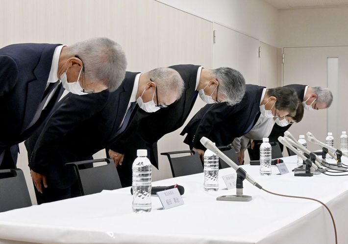 誤診した男子高校生が死亡したことについて、記者会見し陳謝する日本赤十字社愛知医療センター名古屋第二病院の佐藤公治院長(左から4人目)ら=2024年6月17日午後、名古屋市