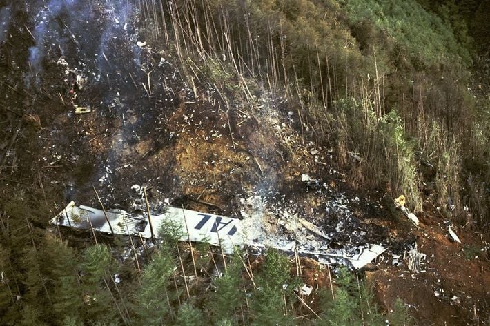 助かったのは女性4人だけだった(山肌を焦がし散乱する日航ジャンボ機の主翼部分、1985年8月13日)