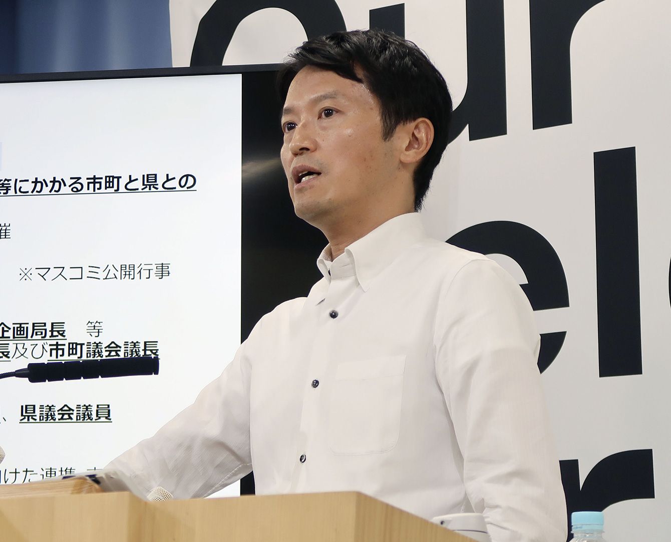 記者会見する兵庫県の斎藤元彦知事=2024年7月24日午後、県庁