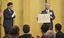 静岡県の川勝平太知事(左)から県民栄誉賞の賞状を授与された京都大の本庶佑特別教授=2019年2月26日夜、静岡市