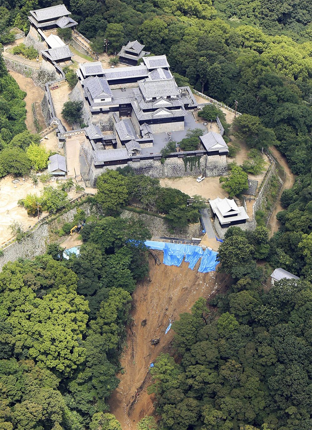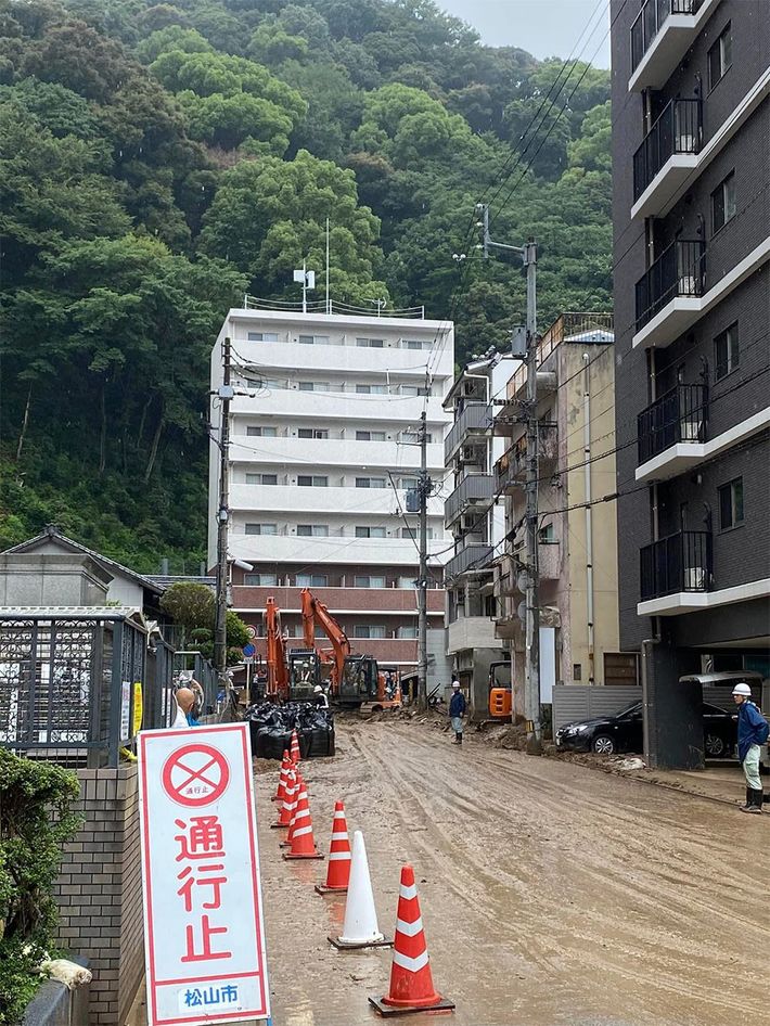 土砂崩れが発生した松山城付近の斜面=2024年7月12日、松山市
