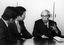 訪れた松下政経塾の卒業生に熱心に語りかける松下幸之助氏(右)=1984(昭和59)年8月29日、松下電器産業本社
