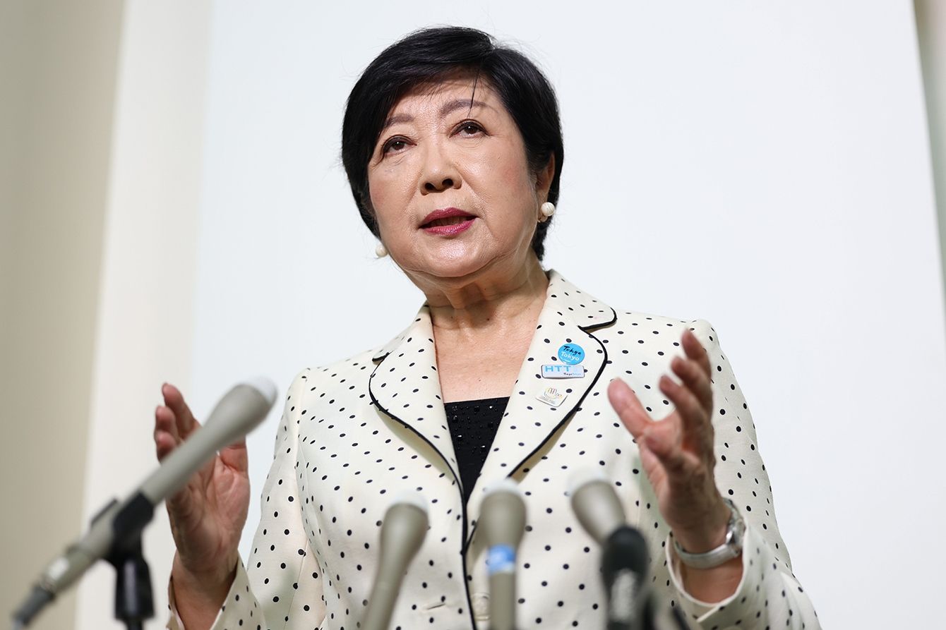 東京都知事選で3選を果たし、報道陣の取材に応じる小池百合子知事=2024年7月8日、東京都新宿区