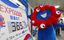 JR西九条駅で行われた大阪・関西万博をPRするイベントで、開幕まで「365日」を示すカウントダウン時計とポーズをとる公式キャラクター「ミャクミャク」=2024年4月13日午前、大阪市