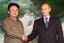 ロシアのプーチン大統領(右)、朝鮮民主主義人民共和国(北朝鮮)の金正日総書記(左)、平壌で共同宣言に調印後、握手=2000(平成12)年7月19日、北朝鮮・平壌