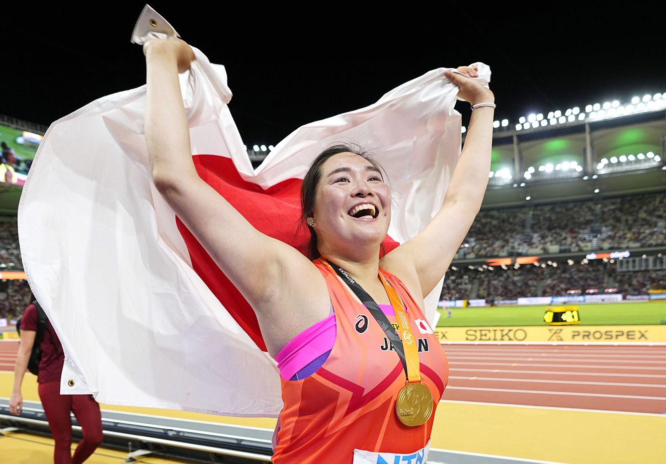 陸上の世界選手権女子やり投げで金メダルを獲得し、日の丸を掲げる北口榛花=2023年8月25日、ブダペスト