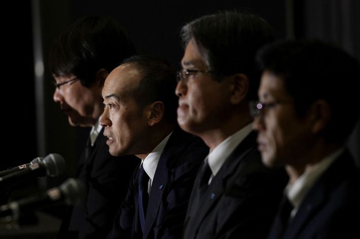 「紅こうじ」サプリを巡る問題で、記者会見する小林製薬の小林章浩社長(奥から2人目)=3月、大阪市